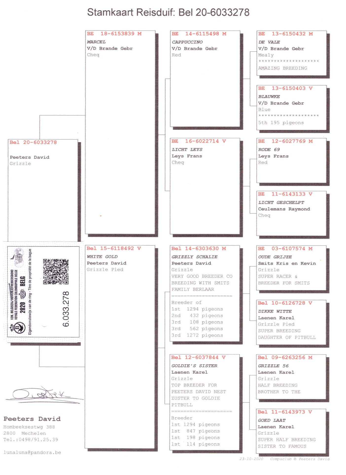 Holub „GRIZLY“ pochádza od TOP chovateľa David PEETERS z Mechelenu. Holub „GRIZLY“ je z párenia holubov „839“ a 492“. Holub „839“ / „MARCEL“ je dochovaný z holuba „CAPPUCCINO“, ktorý je synom TOP párenia „DE VALE“ x „BLAUWKE“, holuby V/D Brande Gebr. a z holubice „LICHT LEYS“, ktorá je z párenia „RODE 69“ x „LICHT GESCHELPT“.