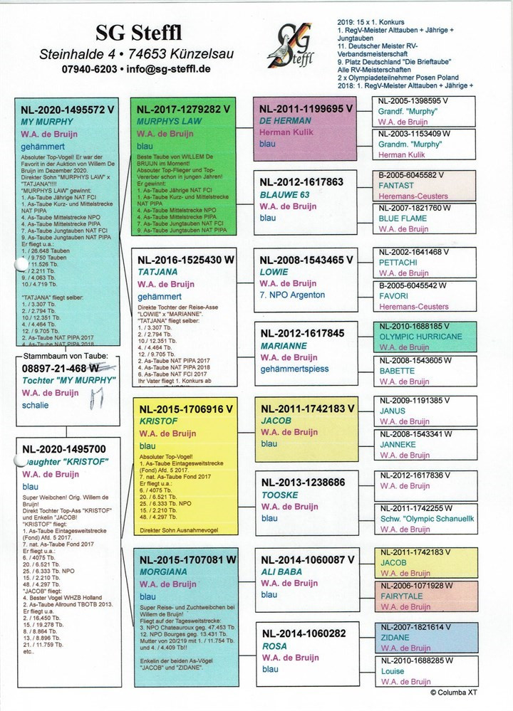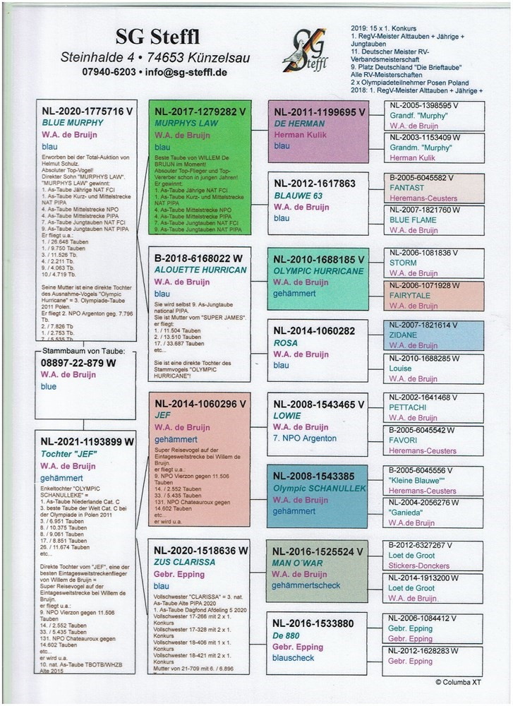 Ponúkaný holub je kombináciou 4 holubov z holubníka SG STEFFL. Holuby SG STEFFL sú známe všade vo svete, keďže sú úspešné nielen v oblastných, či národných pretekoch, ale hlavne vo svetových testovačkách. Ponúkaný holub je produktom tých najlepších holubov značky SG STEFFL ako sú: „MY MURPHY“, „MURPHY´S LAW“, „OLYMPIC HURRICANE“, „APOLLO“, „JACOB“, „MORGIANA“, „TATJANA“, „JEF“.