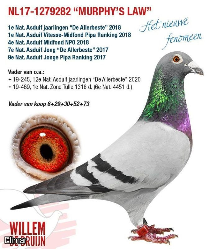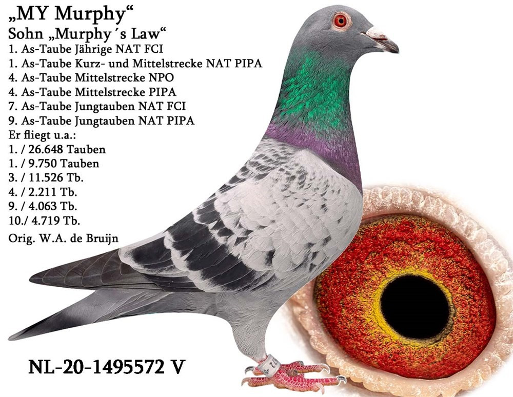 Holub „MY MURPHY“ pochádza z párenia holuba „MURPHY´S LAW“ a holubice „TATJANA“. Výsledky holuba „MURPHY´S LAW“ môžete vidieť vyššie. Holubica „TATJANA“ je z párenia „LOWIE“ a „MARIANNE“ a dosiahla tieto výsledky: 1. / 3 307 hol., 2. / 2 794 hol., 10. / 12 351 hol., 4. / 4 464 hol., 12. / 9 705 hol.,.