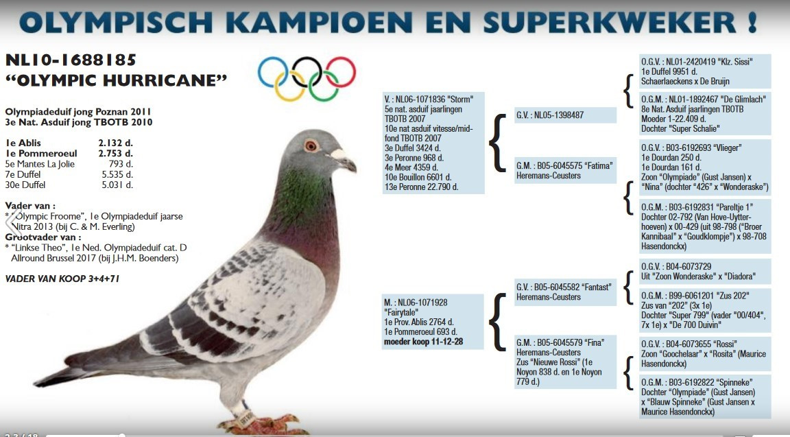 Vážení chovatelia pozývame Vás na aukciu 10 ročných a 2 starší holuby. V našej ponuke nájdete zastúpených viacero línii / rodín ako napr.: PORSCHE 911, BEST KITTEL, WILL & FALCO EBBEN, SG STEFFL ( W. A. de BRUIJN ), PRINCE PORSCHE, LEIDEMAN´S GEBr., OLYMPIC RICO, PITBULL 777, BLIZZARD KING KITTEL. V ponuke TOP holubica na SDT / MARATÓNY z rodiny 100 % COR DE HEIJDE, silno vkrvnený DON MICHEL. V ponuke aj potomkovia nášho chovného číslo 1 = Vnuka holuba FINN s holubicou 100 % PORSCHE 911. Výnimočná ponuka v podobe priameho syna OLYMPIONIKA 1111 a syna Zlatej páry.