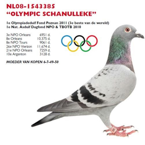 Popis: OTEC: „Olympionik 1111“, víťaz kategórie E v SR, 9. miesto Olympiada, koef. 25,799!, MATKA: TOP chovná holubica 408, priama sestra Olympionika!