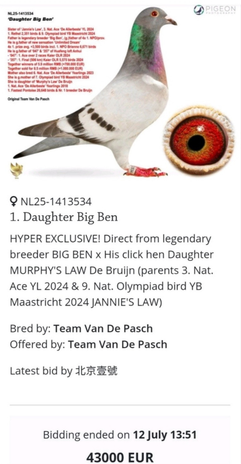 Dňa 12.7.2025 skončila aukcia na zahraničnom portáli, kde vnúča MURPHY´S LAW skončilo na sume 43 000,- Eur. V prílohe môžete vidieť foto a rodokmeň tohto mláďaťa.