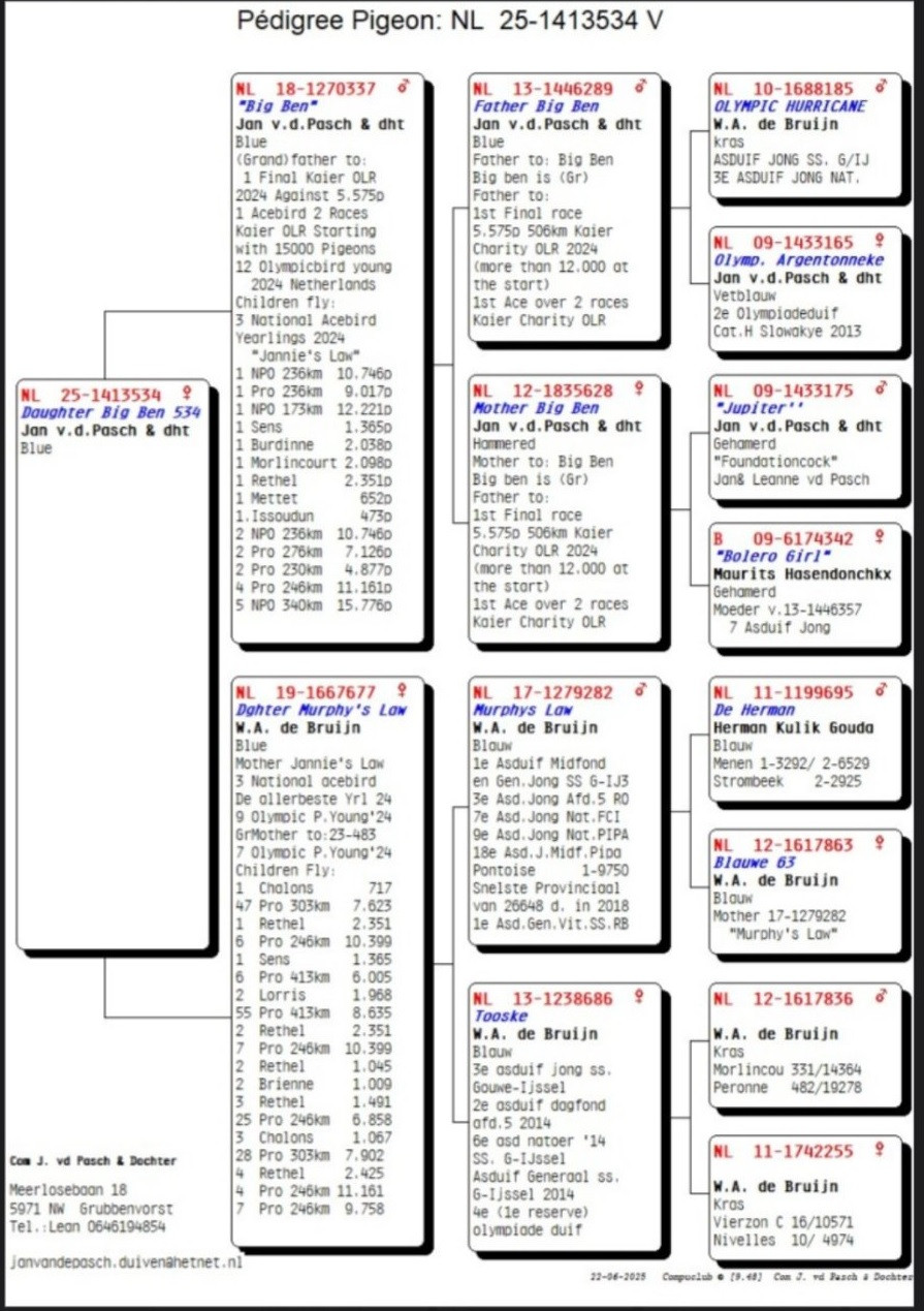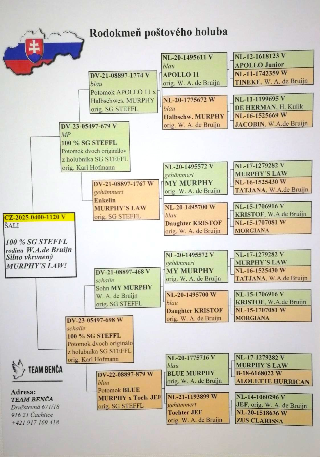 Holub „MY MURPHY“ pochádza z párenia „MURPHY´S LAW“ a holubice „TATJANA“. Výsledky holuba „MURPHY´S LAW“ môžete vidieť vyššie. Holubica „TATJANA“ je z párenia „LOWIE“ a „MARIANNE“ a dosiahla tieto výsledky: 1. / 3 307 hol., 2. / 2 794 hol., 10. / 12 351 hol., 4. / 4 464 hol., 12. / 9 705 hol.,.