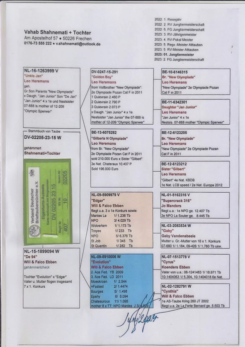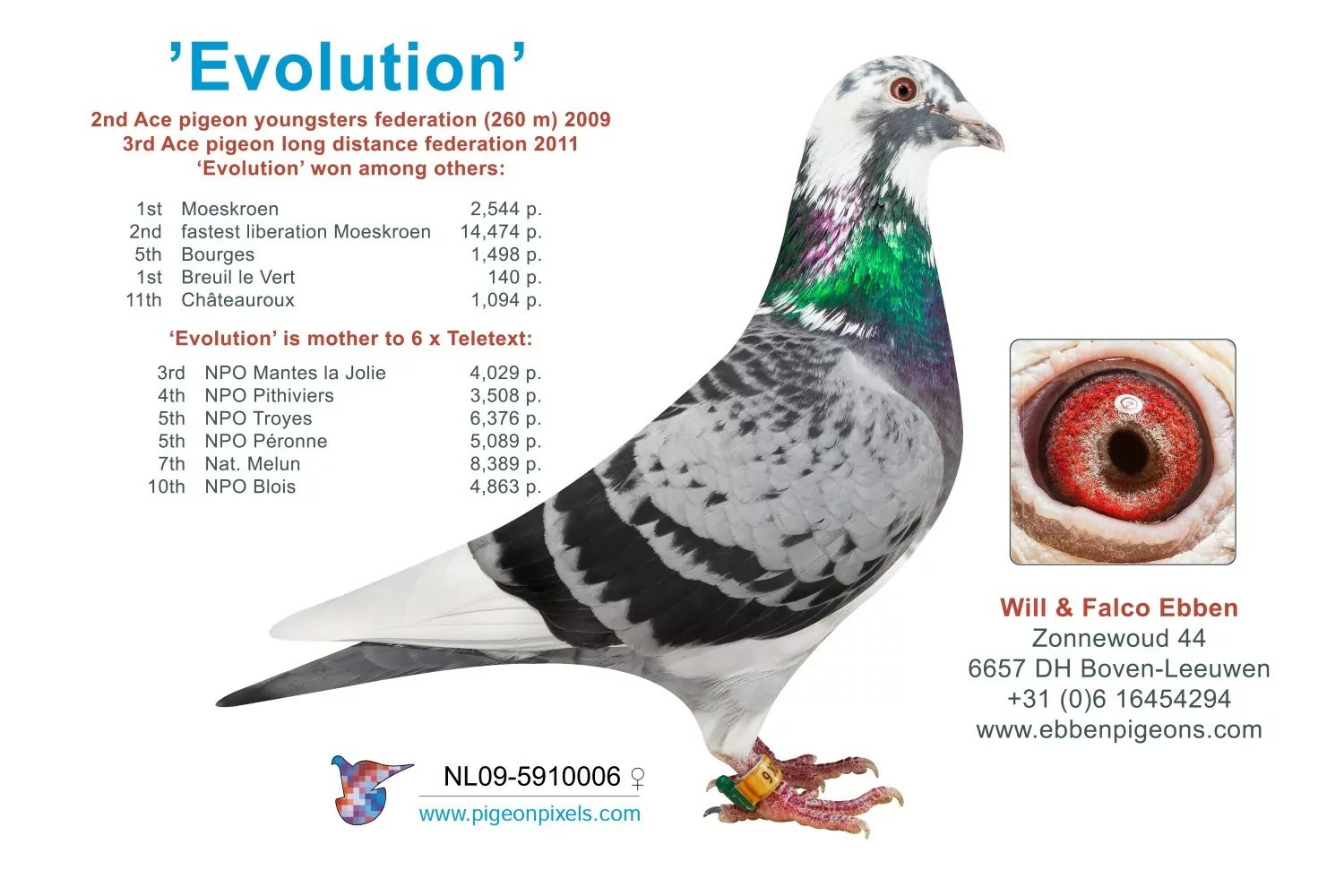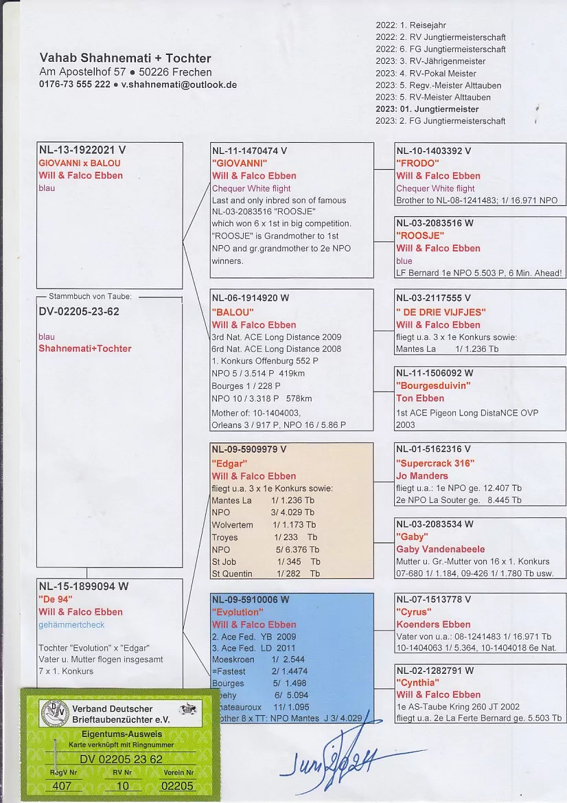 Ide o kombináciu nevlastných súrodencov z rodiny úspešných holubov Will & Falco EBBEN. Obaja rodičia majú rovnakú matku, ktorá je z hviezdneho párenia holubov, ktorý tvoria základ u týchto TOP chovateľov: