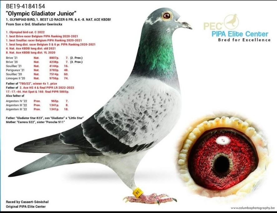 Popis: OTEC: „Olympionik 1111“, víťaz kategórie E v SR, 9. miesto Olympiada, koef. 25,799!, MATKA: TOP chovná holubica 408, priama sestra Olympionika!