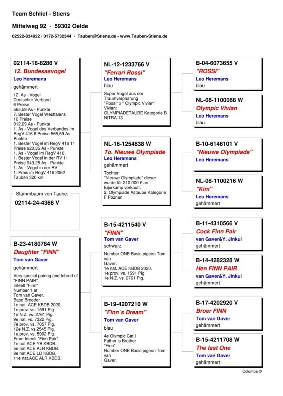 Holub „FINN JUNIOR“: na strane otca máme TOP pretekára, ktorý je vnukom tých najlepších holubov krvi HEREMANS ako sú: ROSSI, OLYMPIC VIVIAN, NIEUWE OLYMPIADE, KIM. Tieto holuby dokázali dochovať olympionikov alebo byť olympionikmi!!!
