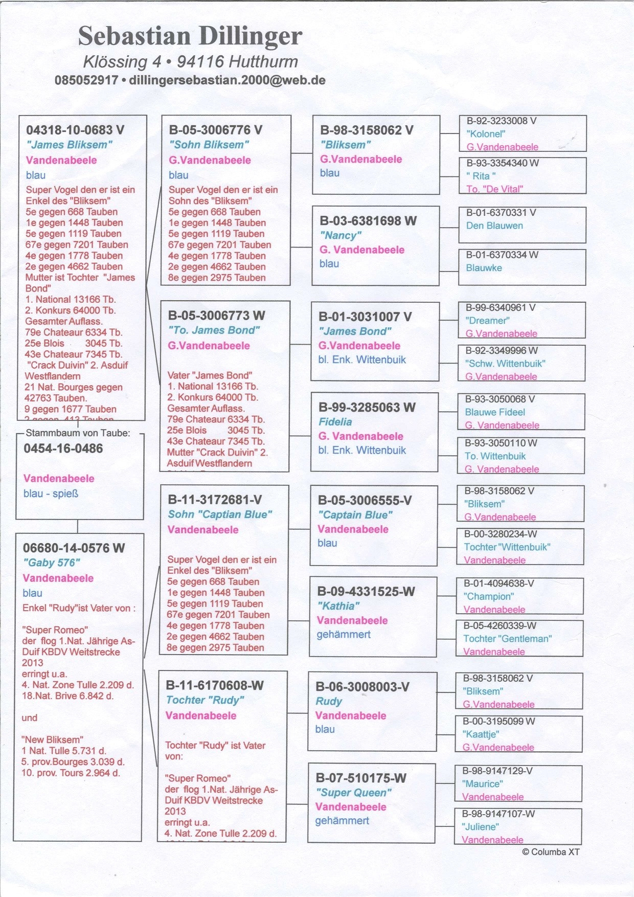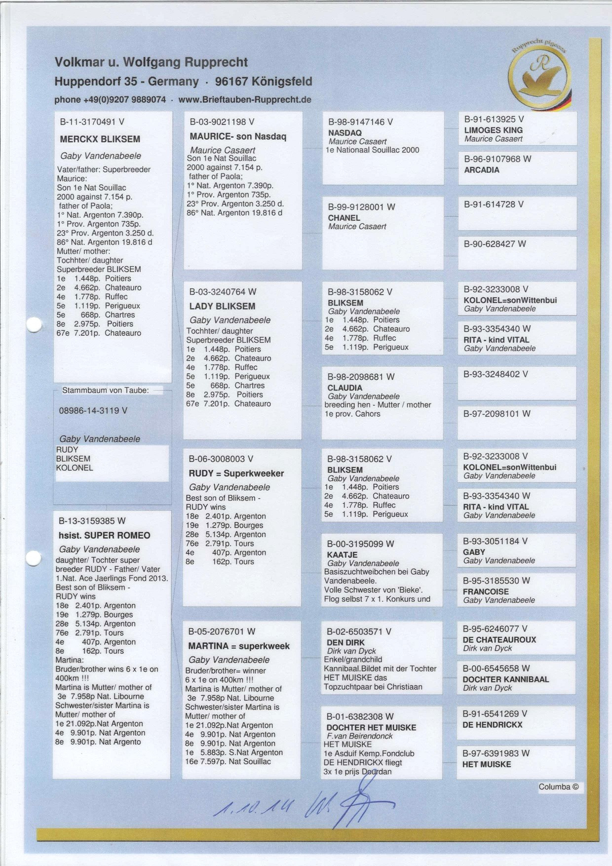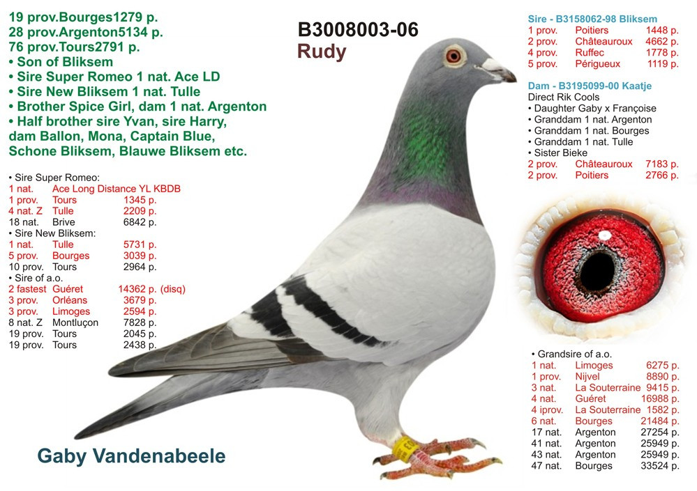 Holubica „0486“ pochádza z dvoch originálov G. VANDENABEELE ( James Bliksem x Gaby 576 ) a zároveň je pravnučkou holubov RUDY a BLIKSEM. V rodokmeni tejto holubice sa nachádzajú tie najzvučnejšie mená chovateľa G.VANDENABEELE: RUDY, BLIKSEM, JAMES BOND, CAPTAIN BLUE.