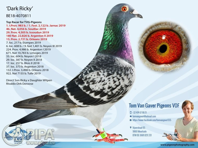 Holub „DARK RICKY“ pochádza z párenia holuba „RICKY“ a holubice „Dochter Witpen Rivaldo“. Holub „RICKY“ bol TOPKA u chovateľa TOM van GAVER a zároveň 9. Nat. ACE KBDB 2014. Holub „WITPEN RIVALDO“ bol 1. Nat. Ace Bird KBDB extra Long Distance 2021.