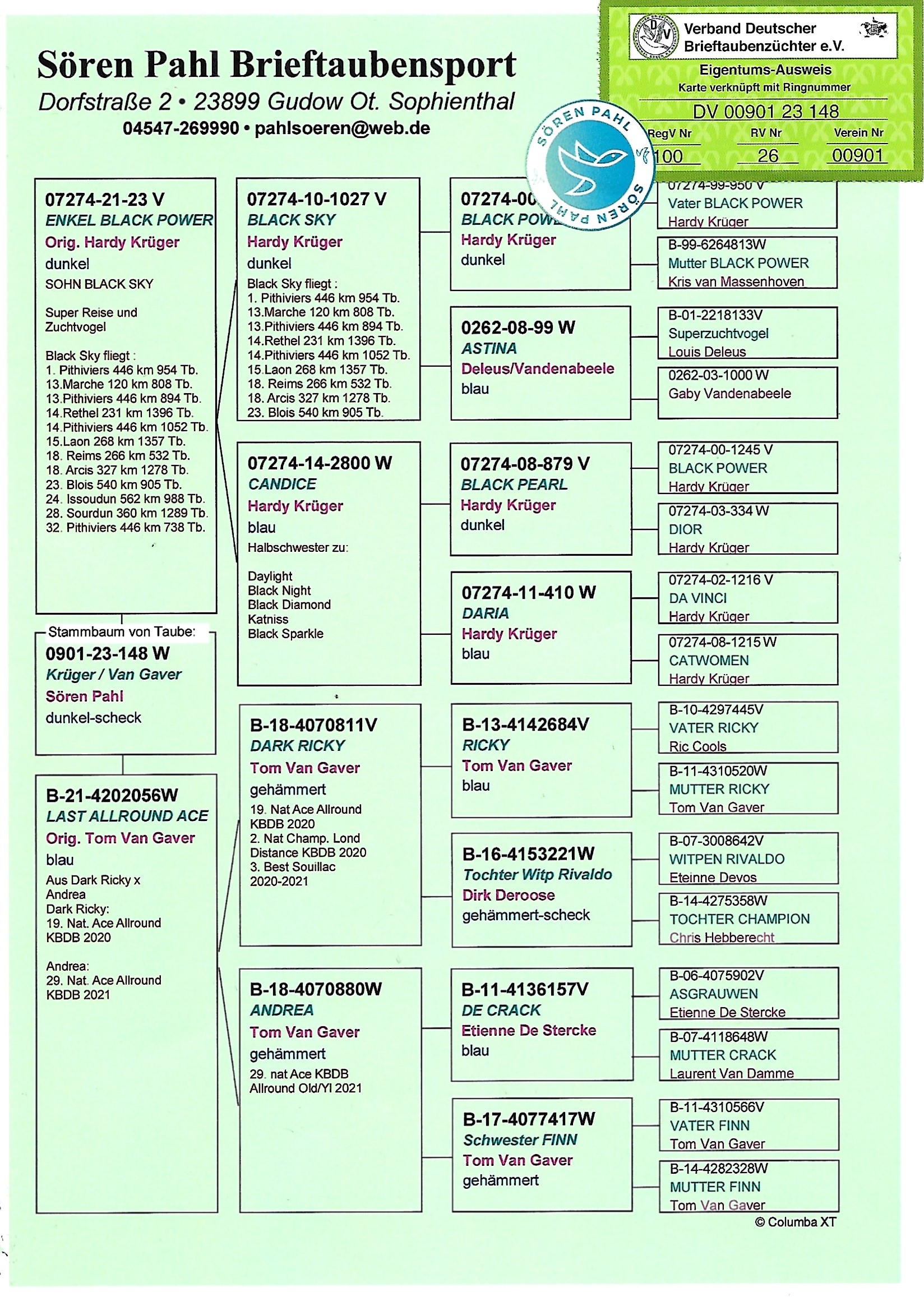 Popis: Potomok kombinácie na SDT / MARATÓNY: 100 % RUTZ und SOHNE & 100 % RUTZ und SOHNE, pôvod holubov ako: Tarbes Princess, Red Star, Ironman..., v rodokmeni viacero víťazov národných pretekov.
