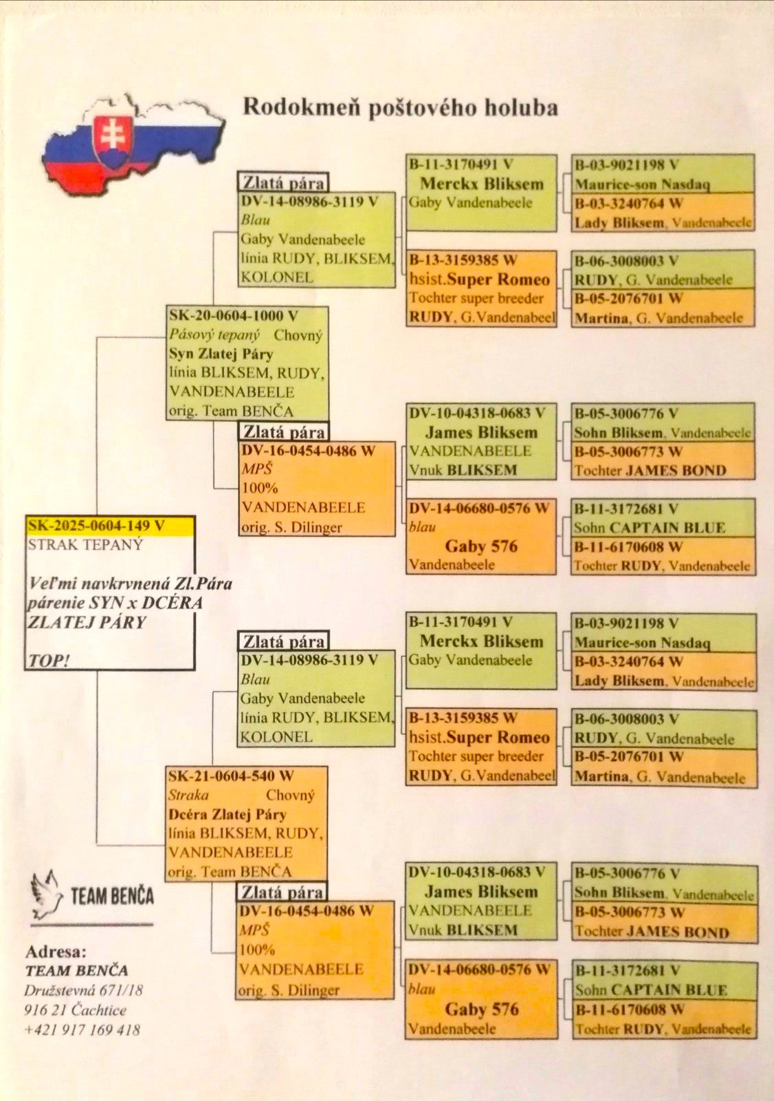 Vážení chovatelia pozývame Vás na aukciu 8 ročných a 6 chovných holubov / holubíc. V našej ponuke nájdete zastúpených viacero línii / rodín ako napr.: LEIDEMAN´S GEBr., PRINCE PORSCHE, BEST KITTEL, HARDY KRUGER (BLACK POWER, HUGO BOSS, ARMANI), TOM van GAVER (FINN / RICKY), DE FIGO. V ponuke TOP chovná holubica na SDT / MARATÓNY z rodiny TEAM PIEPER, či kapratá holubica RUTZKA = 100 % RUTZ und SOHNE. V ponuke aj potomkovia nášho chovného číslo 1 = Vnuka holuba FINN s holubicou z rodiny PORSCHE, ale aj starou mamou TOP mláďaťa TS 2025 holubicou GAVERKA (=pravnučka RICKY). V ponuke aj výnimočný holub 149 – obojstranný vnuk ZLATEJ PÁRY, či posledná holubica z chovu v ponuke z rodiny BELMONDO. Veríme, že každý holub / holubica z ponuky v prípade vydraženia bude prínosom Vašej chovnej voliéry 2026. Želáme veľa úspechov v sezóne 2026 – VÁŠ TEAM BENČA.