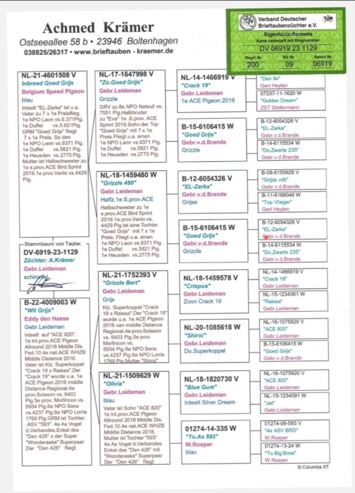 Popis: OTEC: Holub „ACHMED“, vnuk holubov LEIDEMAN´S GEBr. ako: SON GOED GRIJS 998, GRIZZLE DREAM, GRIZZLE BERT a OLIVIA! MATKA: Holubica „RICKA“, párenia syna RICKY na vnučku RICKY, silno vkrvnená RICKY – TOM van GAVER, orig. Ulrich Franzsander.
