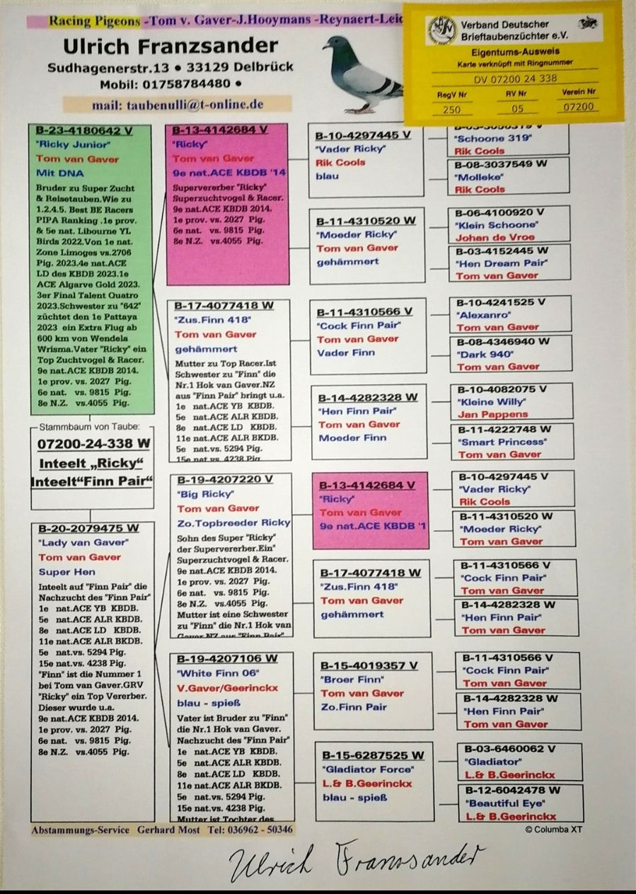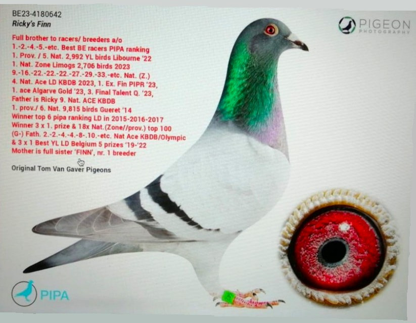 O úspechoch v pretekoch, či svetových testovacích staniciach odchovov z holubov „FINN“, „RICKY“, odchovy „FINN PAIR“, potomstvo kombinácie „FINN“ & „FINN´S DREAM“, potomstvo „RICKY“ & „Zus.Finn 418“ sa dočítate pri holubovi na prvej pozícii ( v anglickom jazyku ). Zdroj z portálu PIPA.BE 05/2025.