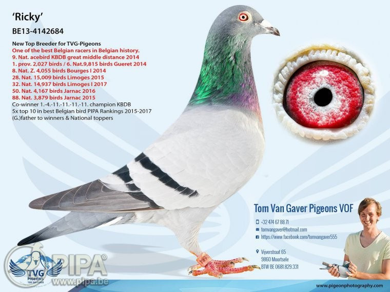 Holubica „RICKA“ pochádza z párenia holuba „RICKY JUNIOR“ a holubice „LADY VAN GAVER“. Holub „RICKY JUNIOR“ je z hviezdneho párenia holuba „RICKY“ a holubice „Zus.Finn 418“ (=sestra holuba „FINN“). Tento hviezdy pár má na konte obrovské množstvo úspechov, aspoň vypichneme 2 úspechy: