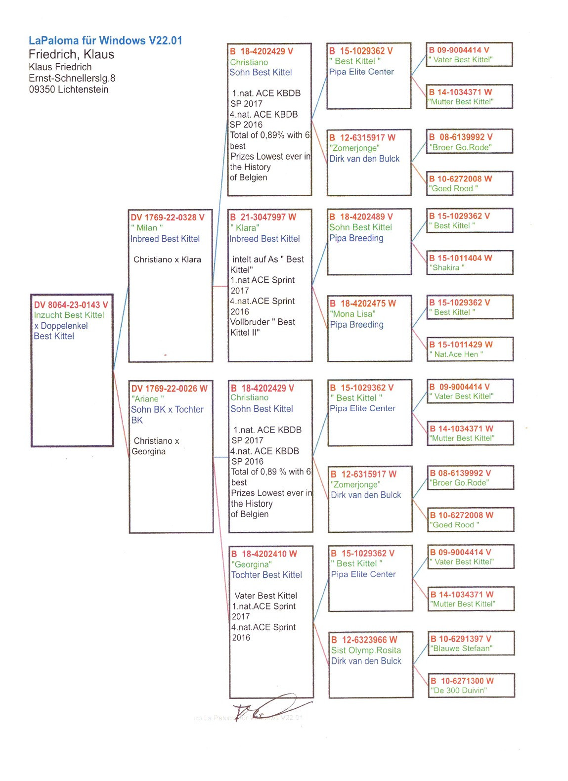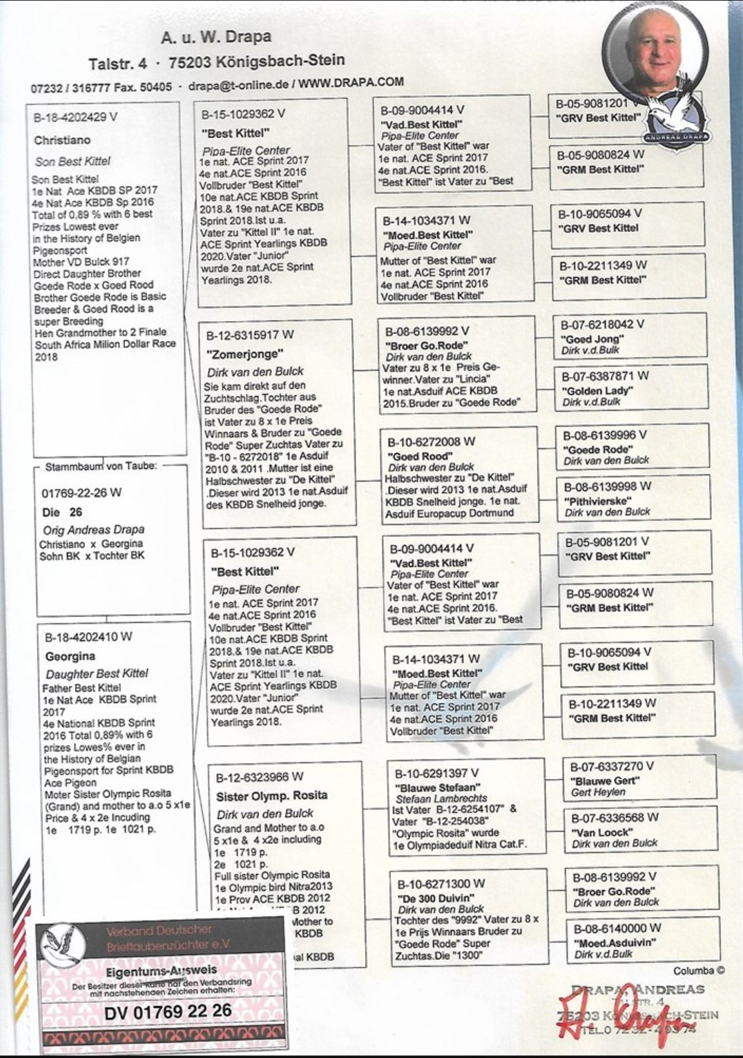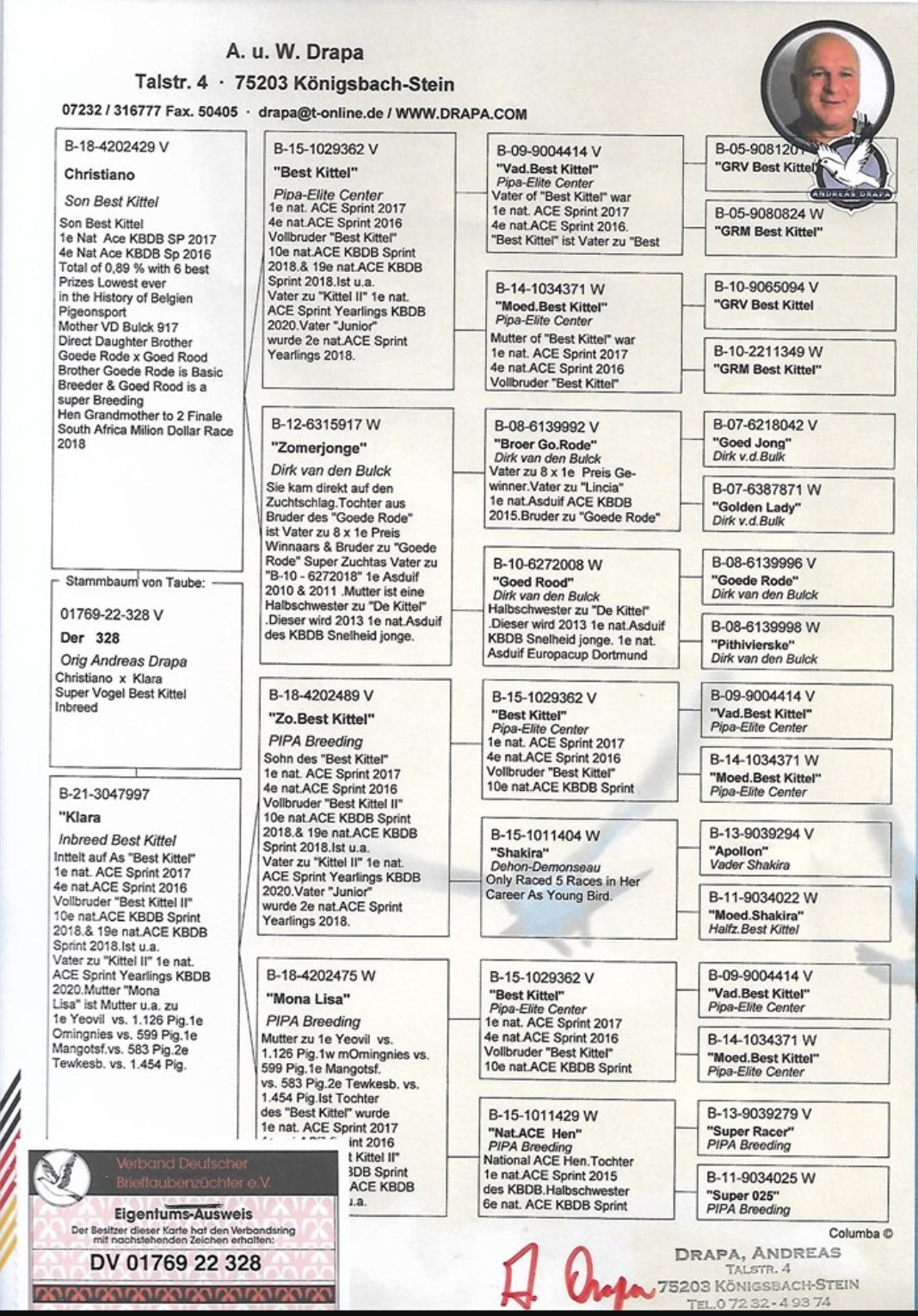 Línia BEST KITTEL od roku 2018 získala viac ako 200 x 1. cena! Víťazstvá v pretekoch a svetových testovačkách. Pôvod rodičov od A. u W. Drapa. Holubica / holub čistej línie BEST KITTEL.