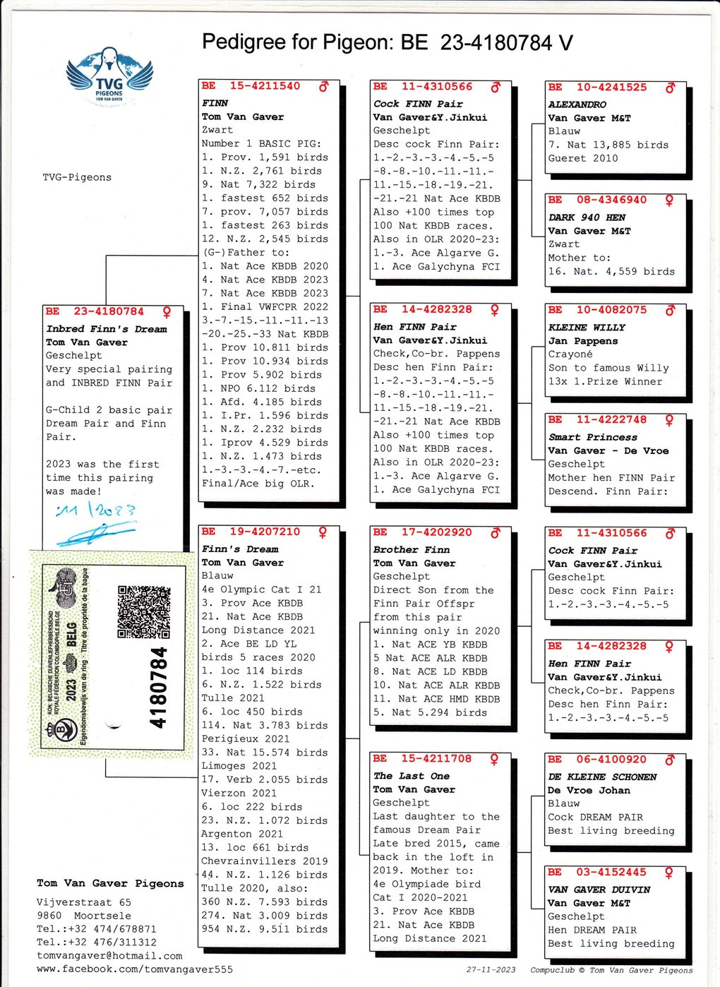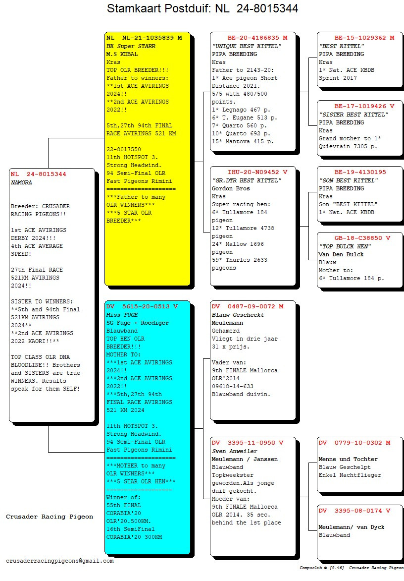 Ide o výnimočné párenie – TOM van GAVER & FINN / RICKY a PIPA ELITE CENTER & BEST KITTEL. Toto sú dve najúspešnejšie rodiny posledné 2/3 roky vo svetových testovačkách, kde tieto odchovy holubov patria k tým najlepším buď v TOP 10 finále alebo TOP 10 ESO svetových TS. Je to jediné mláďa z tejto kombinácie zo sezóny 2025 a po dlhšom zvažovaní uvoľnené do aukcie.
