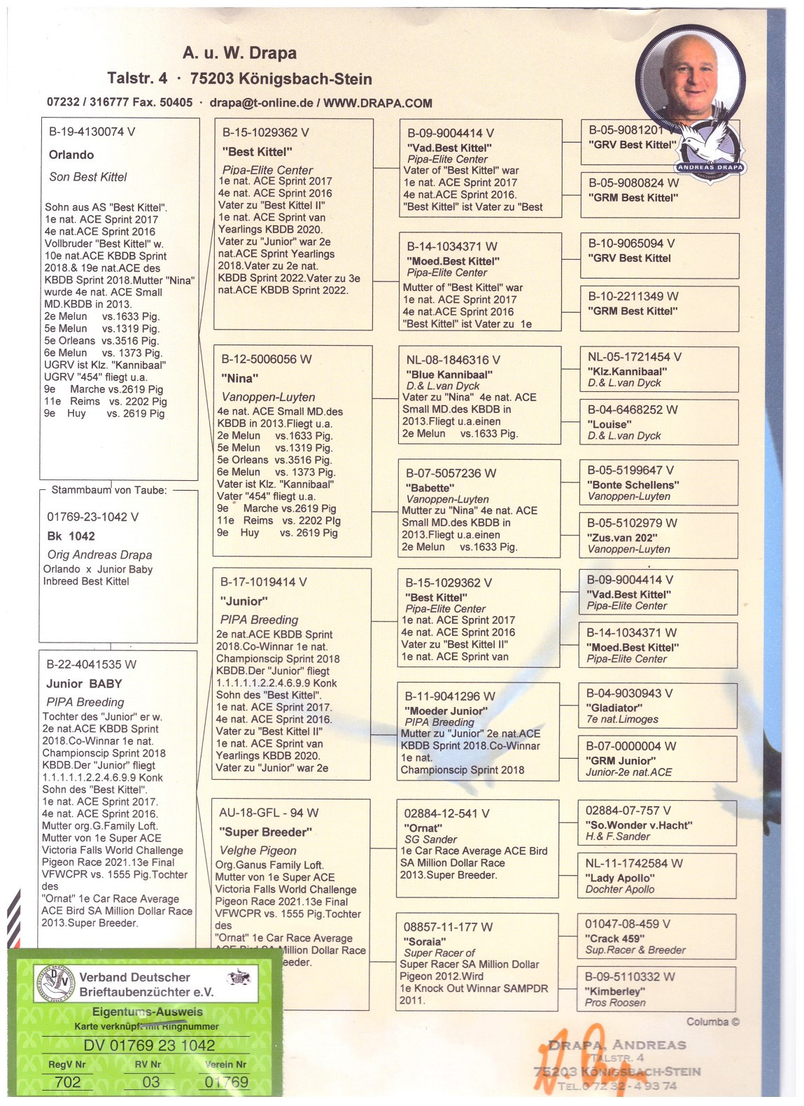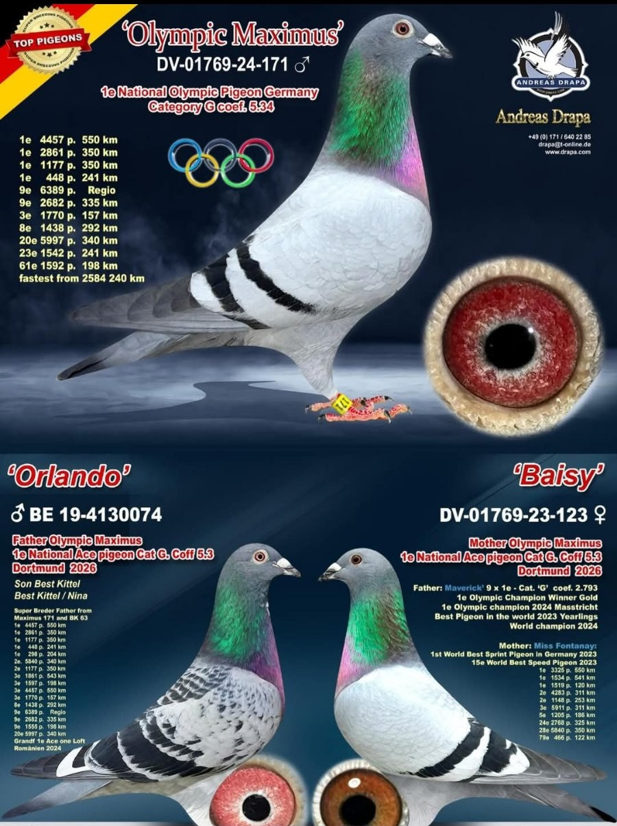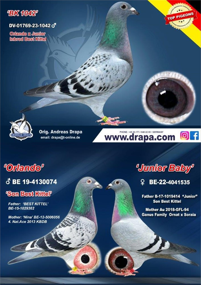 Rodina holubov BEST KITTEL patrí k najúspešnejšej u p. Drapu. Holub MAVERICK, najrýchlejší holub sveta je synom holuba CHRISTIANO. Holub CHRISTIANO je priamym synom holuba BEST KITTEL. Súčasný najvačší skvost z rodiny BEST KITTEL olympionik OLYMPIC MAXIMUS, ktorý bol olympionikom v kat. G v Dortmunde 2026. Tento holub získal 4x 1. cenu a striebornú medailu z olympiády. Jeho otec je ORLANDO – syn holuba BEST KITTEL. Zároveň matka ponúkanej holubice 268 je polosestra holuba OLYMPIC MAXIMUS, keďže majú rovnakého otca=holuba ORLANDO.
