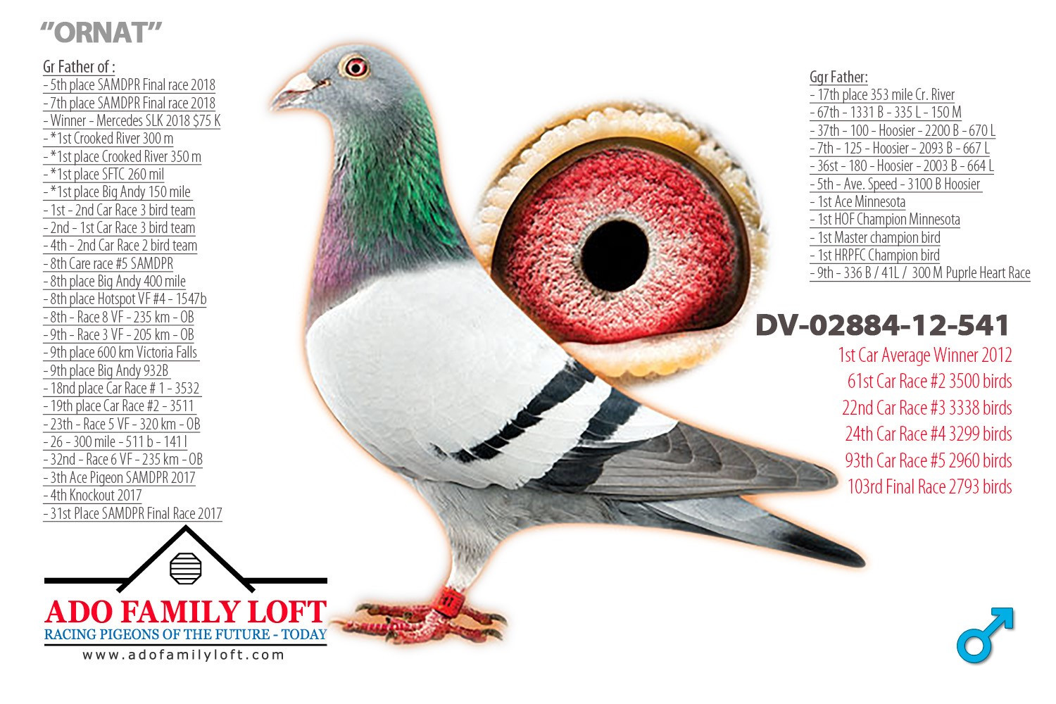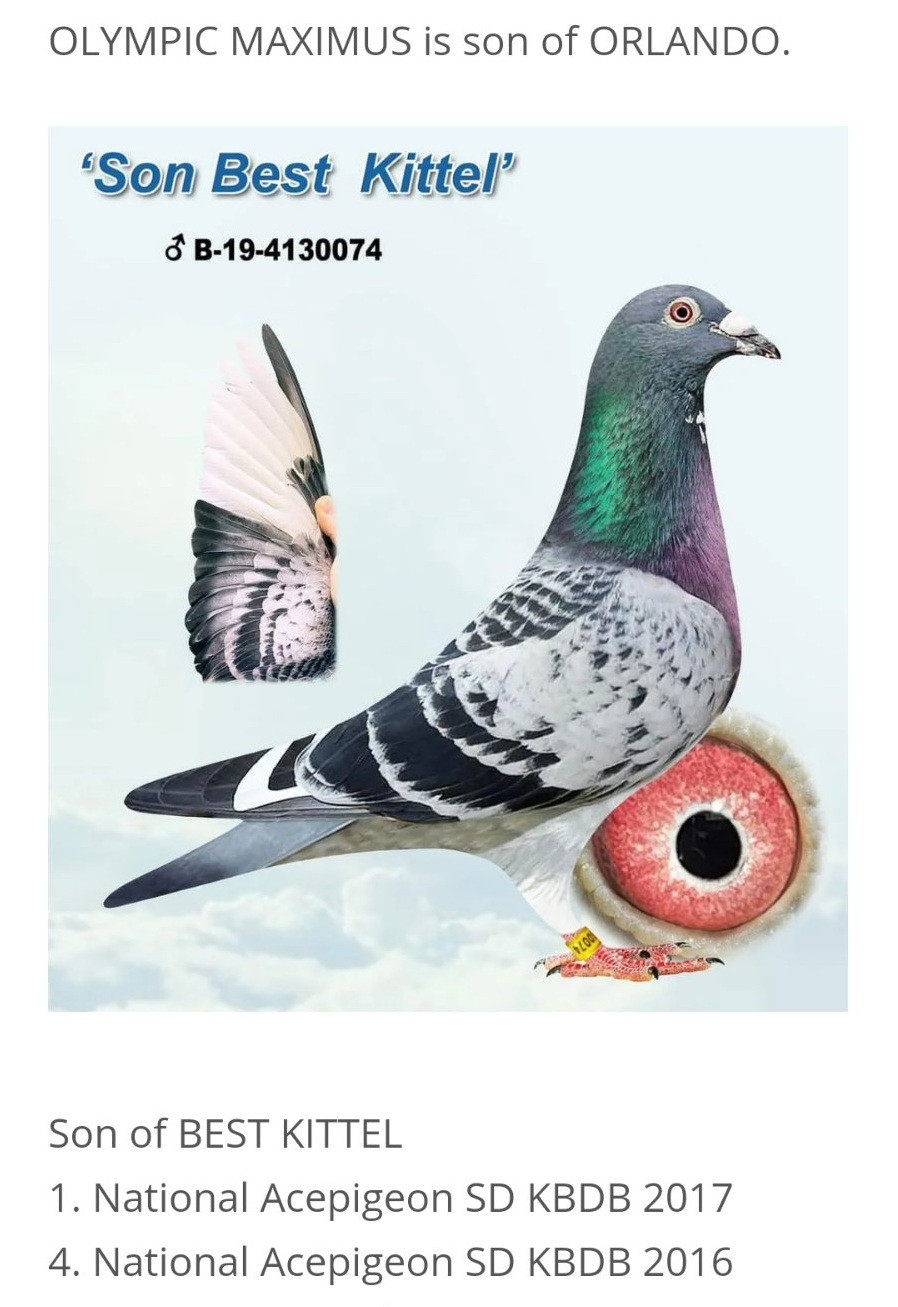 Holub „ORLANDO“ je z párenia holuba BEST KITTEL a holubice „NINA“. Holub BEST KITTEL je vo svete známy ako super holub a aj zo super chovným potomstvom všade vo svete, či už v národných pretekoch alebo v pretekoch svetových testovačiek.