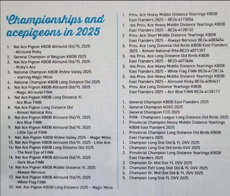 O úspechoch v pretekoch, či svetových testovacích staniciach odchovov z holubov „FINN“, „RICKY“, odchovy „FINN PAIR“, potomstvo kombinácie „FINN“ & „FINN´S DREAM“, potomstvo „RICKY“ & „Zus.Finn 418“ sa dočítate nižšie. Zdroj z portálu PIPA.BE z aukcii 05/2025.