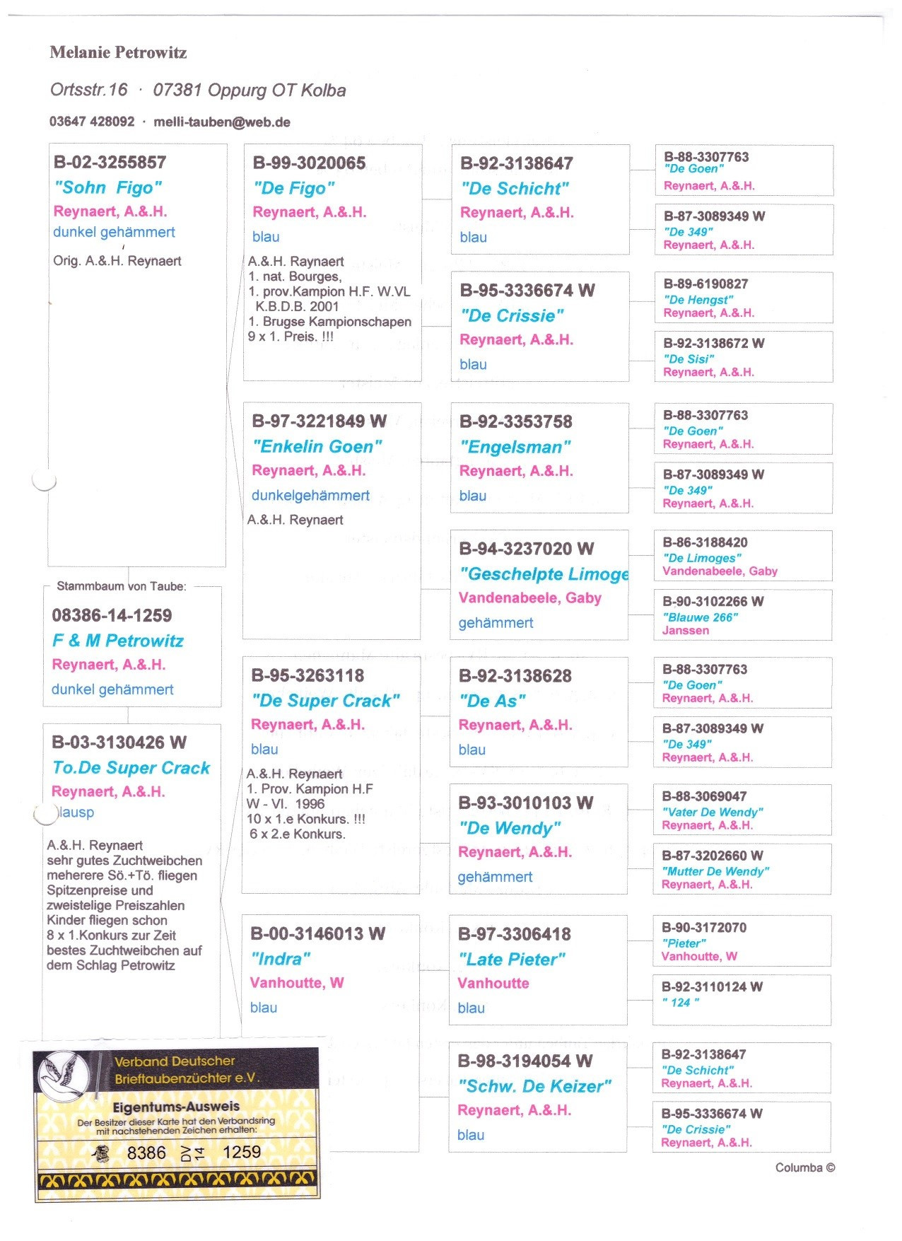 Rodokmeň holubice „1259“, orig. M. Petrowitz