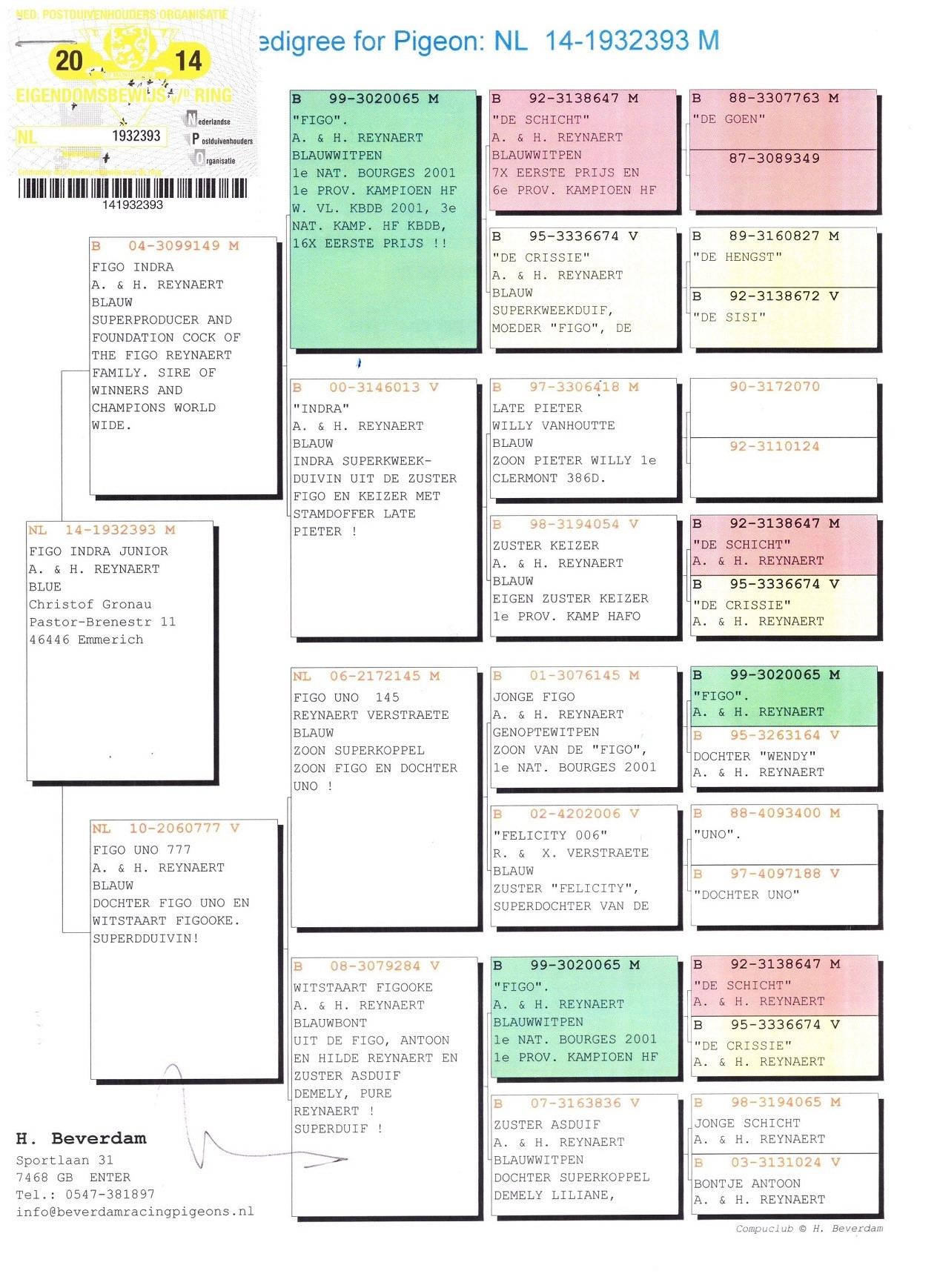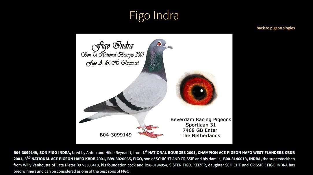 FIGO INDRA JUNIOR je dochovaný na strane otca z FIGO INDRA, ktorý je potomok TOP párenia holuba B 99-3020065 „DE FIGO“, 15 x 1e, A. & H. REYNAERT a holubice B 00-3143013 „INDRA“ TOP hen, A. & H. REYNAERT. Na strane matky máme holubicu NL 10-2060777, FIGO UNO 777, A. & H. REYNAERT, ktorá je dochovaná z párenia vnuka DE FIGA ( FIGO UNO 145) na dcéru DE FIGA (WITSTAART FIGOOKE).