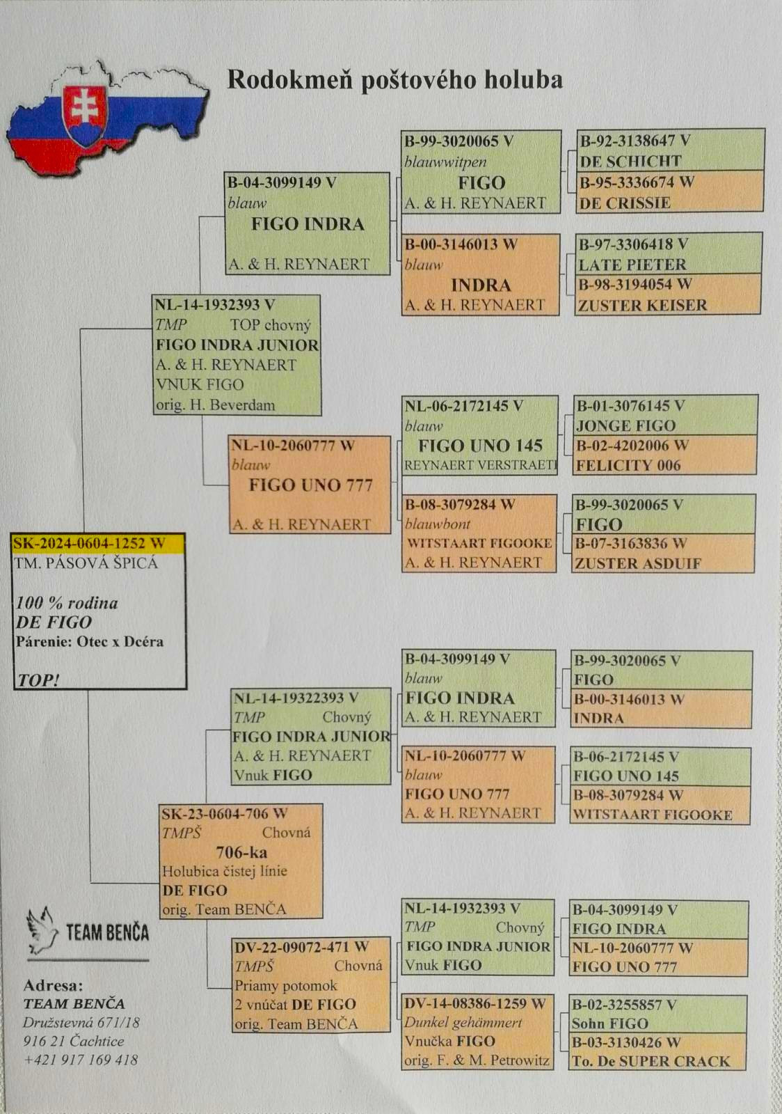 Ponúkaná holubica je čistým potomkom holubov rodiny DE FIGO. Ide zároveň o vkrvneného potomka chovného holuba FIGO INDRA JUNIOR, keďže holubica 1252 je z párenia na vlastnú dcéru. Odchovy z tohto holuba úspešne pretekajú na viacerých holubníkoch. Teší nás, že súrodenci ponúkanej holubice úspešne chovajú u TOP chovateľov v OZ NITRA, či OZ TOPOLČANY.