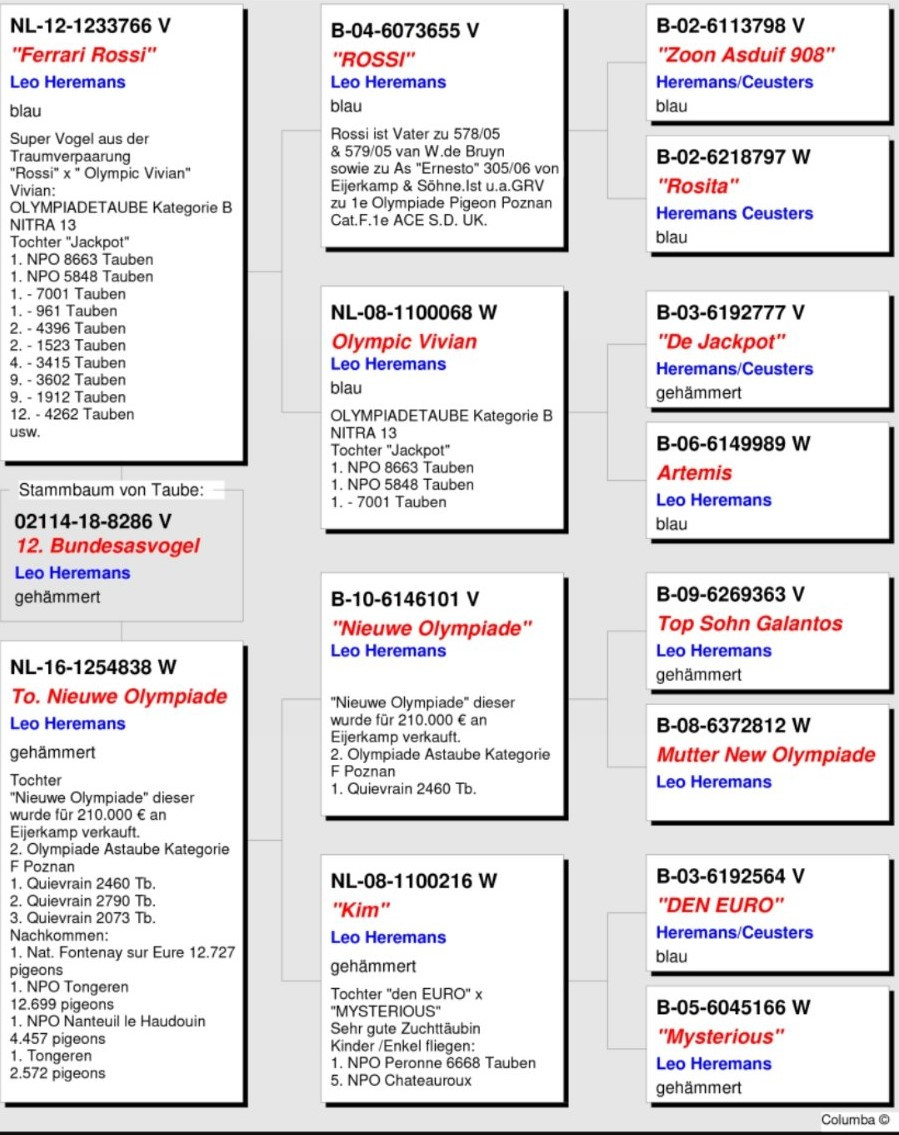 OTEC: Holub „FINN JUNIOR“, párenie TOP holuba krvi HEREMANS na dcéru holuba FINN (TOM van GAVER), orig. Team SCHLIEF & STIENS,