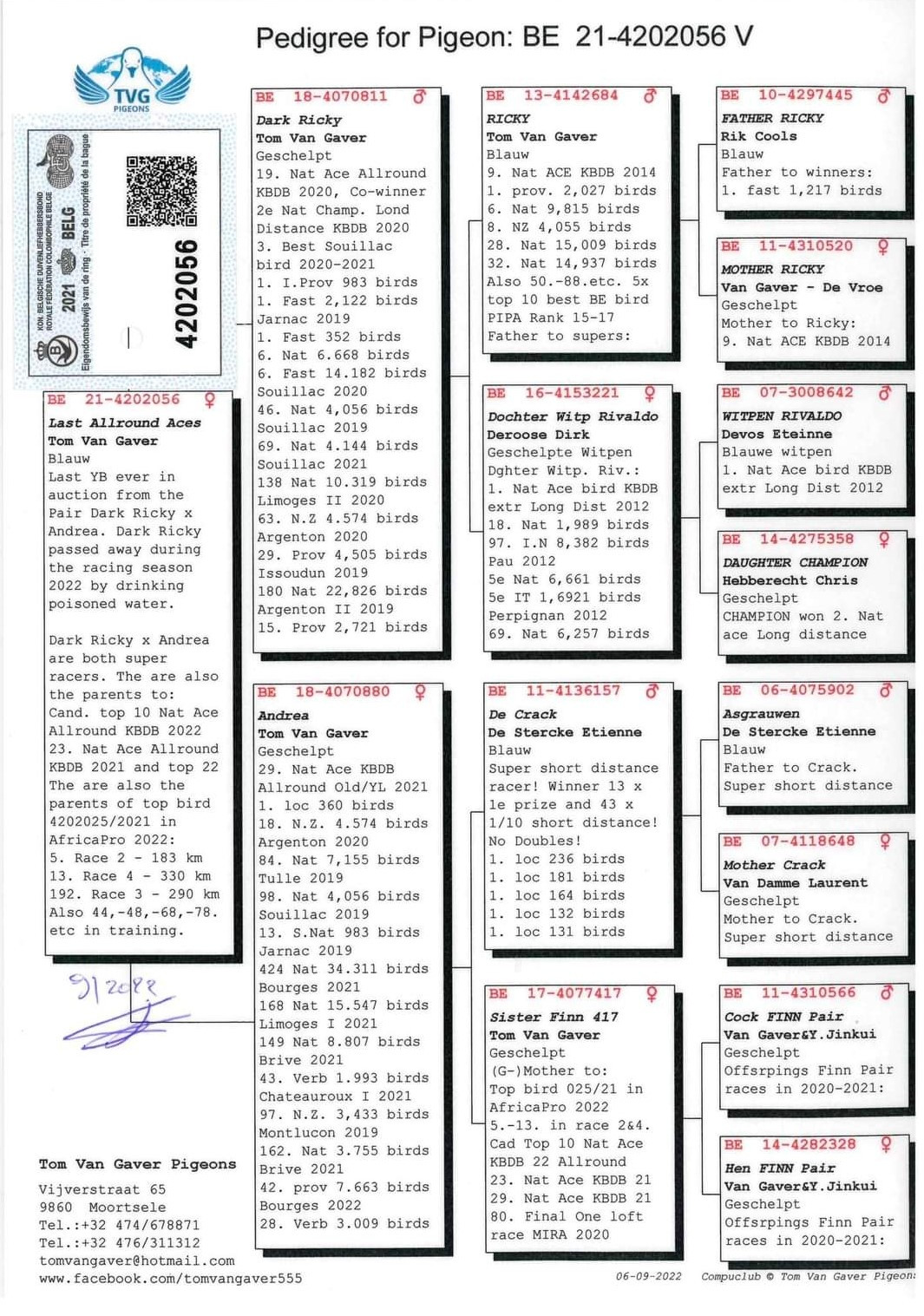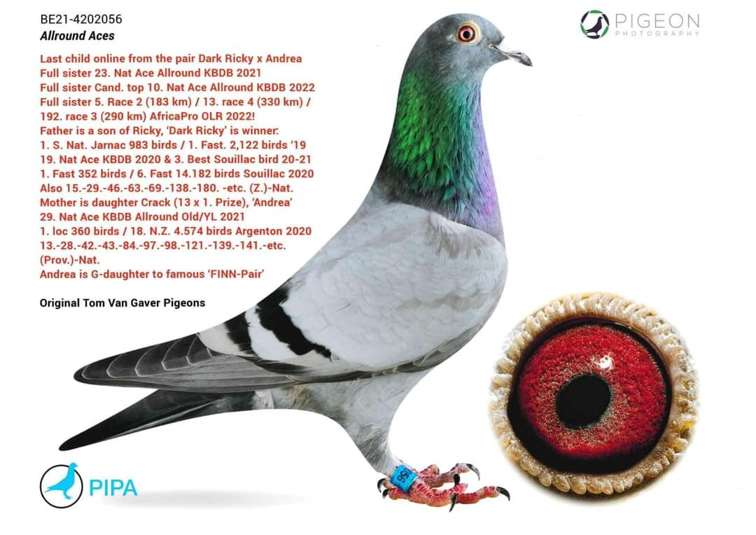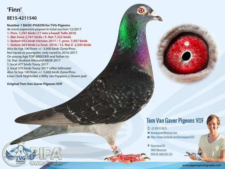 Ponúkaný holub je kombináciou holubov: otec - VNUK FINN x matka - PRAVNUČKA RICKY. Pôvod holubov TOM van GAVER, obohatené o krv olympionikov a najlepších holubov od LEO HEREMANS a rodina holubov BLACK POWER od HARDY KRUGER.