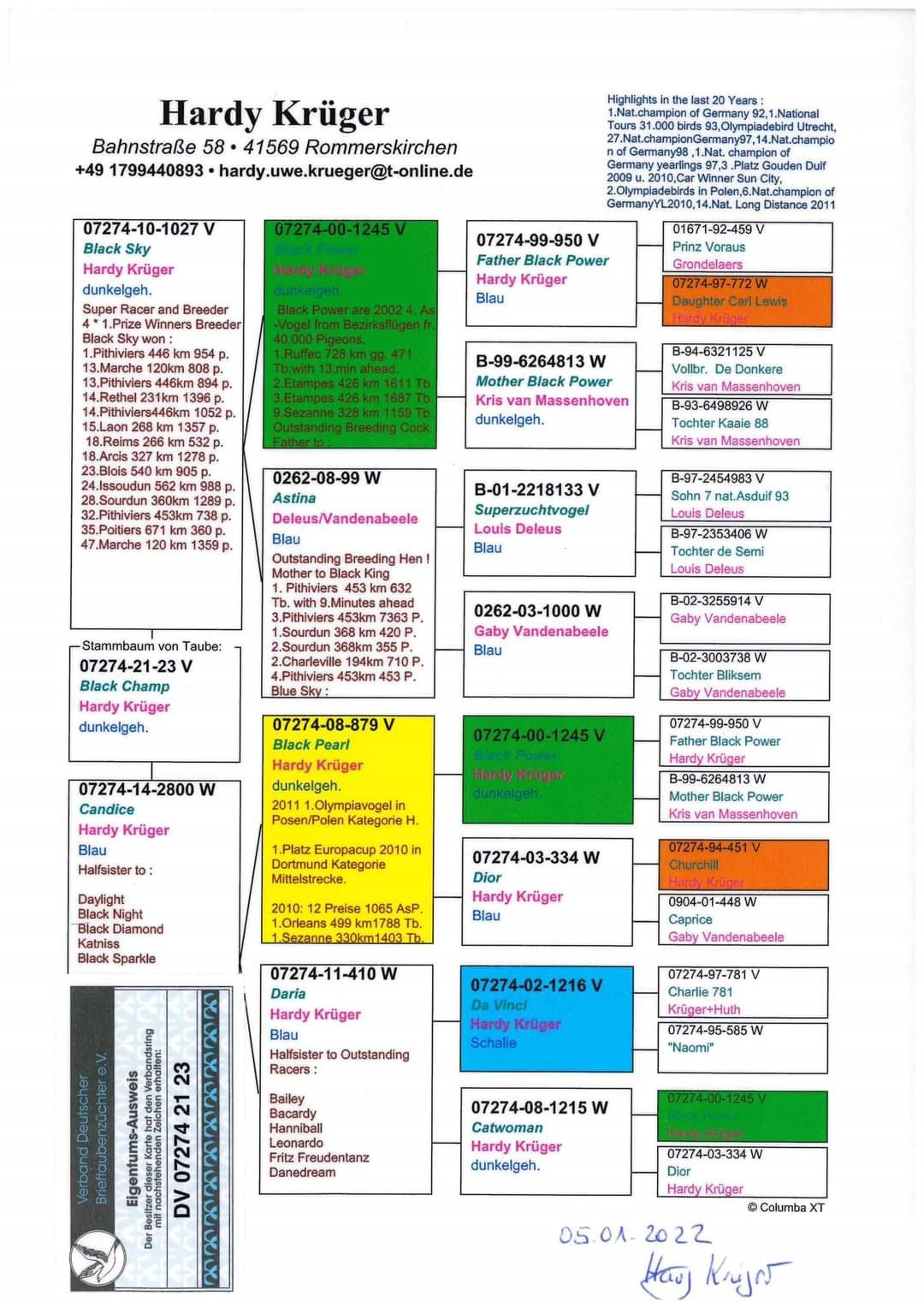 Rodokmeň starého otca, holub BLACK CHAMP, párenie Black Sky x Candice, orig. Hardy Kruger