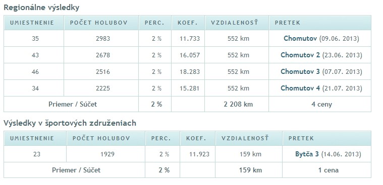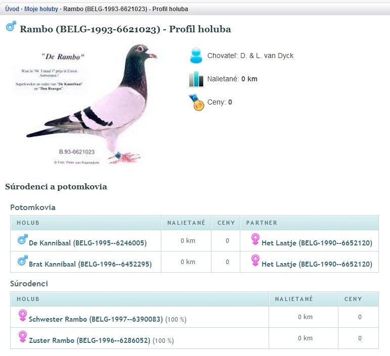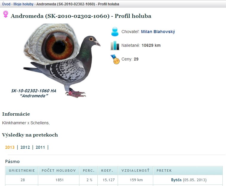 Úvod · Články o poštových holuboch · Z nášho obchodu · Program "Moje holuby"Program "Moje holuby"Ak ste v sezóne 2013 sledovali súťaž Veľká cena holubar.sk, určite ste zaregistrovali pojem "Profil holuba". Jedná sa o internetovú stránku so zobrazením informácií o konkrétnom poštovom holubovi, jeho mena, fotografie, označenia, chovateľa, aktuálneho majiteľa, no, čo bolo najzaujímavejšie - súhrn jeho životných výsledkov na pretekoch zoskupený podľa typu výsledkov (pásmo, oblastné združenie, región, športové združenie), doplnený o vypočítaný koeficient FCI, percento, v ktorom holub z daného preteku priletel atď. ![]() Profil holuba V krátkosti povedané, všetky podstatné informácie na jednej stránke, dostupné na pár kliknutí. Ak by na tejto stránke bol ešte aj rodokmeň holuba, už sa dá hovoriť o celkom slušnej prezentácii. No komu by sa chcelo pre každého pretekára niekam vypisovať všetky jeho výkony pre každý typ výsledkov? Každý, kto si takéto záznamy prácne vedie dobre vie, že to stojí kopec času či už pri papieroch alebo počítači a ak je potrebné tieto informácie do iných formátov, napr. kvôli tlači alebo online prezentácii, je to otrava. Pre zjednodušenie tejto neľahkej no dôležitej chovateľskej práce existuje viacero dobrých programov a jeden je oddnes prístupný aj na stránkach holubar.sk. Program je predstavený pod jednoduchým menom "Moje holuby" a môžete k nemu pristupovať z ľavého menu, časť "Pre chovateľov", neskôr bude presunúť priamo na hornú lištu do hlavného menu. Program bol vyvíjaný od novembra 2012, v testovacej prevádzke funguje od apríla 2013, keď sa staral o vyhodnotenie Veľkej ceny holubar.sk. No pri Veľkej cene ste mohli vidieť iba jednu jeho časť. Čo teda program všetko dokáže? Automatický záznam výsledkov pre každého holubaOkamžite po pridaní holuba do databázy (za predpokladu, že vyberiete organizáciu, kde holub preteká) program prehľadá všetky pridané záznamy výsledkov pre danú organizáciu a nájdené záznamy zapíše do profilu holuba. Jediné, čo je potrebné urobiť je zapísať správne označenie holuba z rodovej obrúčky (krajina, rok, organizácia, číslo obrúčky) a vybrať organizáciu, kde holub preteká. Prehľadávané sú záznamy výsledkov pridané na stránky holubar.sk. V čase písania tohto príspevku je v databáze viac ako 2400 záznamov výsledkov z celého Slovenska, minimálne jednu sezónu má na stránkach pridanú väčšina slovenských OZ. ![]() Autoamticky zaznamenané výsledky Ak chcete, aby pre Vaše holuby program našiel výsledky aj z minulosti, stačí výsledky pridať na stránky holubar.sk. Pridávanie výsledkov je záležitosťou zopár kliknutí a nie je nijako náročné. Pre každého holuba je vedený súčet cien a kilometrov, ktoré za život nalietal a konkrétnymi výsledkami za život rok po roku sa viete preklikať priamo v profile holuba. Vyhľadávanie výsledkov funguje "obojsmerne" - ak pridávate nového holuba, program prehľadá všetky existujúce záznamy výsledkov a na druhej strane, pri pridávaní nových výsledkov v nich program vyhľadá všetky pridané holuby z databázy, ktoré sa majú vybranú danú organizáciu. Automatické vyhodnotenie súťažíPodobne ako program počítal z týždňa na týždeň poradie v kategóriách Veľkej ceny holubar.sk, dokáže vyhodnocovať aj iné súťaže. Už v nasledujúcich dňoch pribudne vyhodnotenie MS 2013 pre mladé holuby pre všetky pridané holuby z ročníka 2013 spolu s možnosťou automatického vypísania prihlášky. Ak sa Vám nechce trápiť s hľadaním najnižších koeficientov pre Vaše mláďatá alebo s vypisovaním prihlášky, pridajte Vašich nádejných mladíkov do programu, skontrolujte, či sú na stránkach holubar.sk všetky výsledky pretekov, ktorých sa mláďatá zúčastnili a program sa o ostatné postará za Vás. Vyplnenú prihlášku si len vytlačíte, necháte skontrolovať v OZ a podpísanú odošlete. Chybičkou krásy je chýbajúca podpora výsledkov pre ZO, chovatelia, ktorí používajú do MS aj klubové výsledky zatiaľ automatické generovanie prihlášky nevyužijú. Podobne je možné vypočítať poradie všetkých oficiálnych kategórií podľa FCI. Automatická tvorba rodokmeňovEšte koncom roka 2012 bola sprístupnená stránka pre tvorbu jednorazových rodokmeňov. Rodokmeň si tu vytvorili desiatky chovateľov pre stovky svojich holubov. Komu sa však chce pokaždé vypisovať celý rodokmeň? Program "Moje holuby" rieši aj tento problém. ![]() Autoamticky generovaný rodokmeň V úvodnej verzii si pri vkladaní holubov máte možnosť vybrať otca a matku práve pridávaného holuba. Ak ste otca ani matku do programu ešte nepridali, máte možnosť záznam holuba kedykoľvek upraviť. Ak ste rodičov do programu pridali až neskôr, stačí po ich pridaní upraviť záznam holuba a vybrať rodičov. Ak pre holuba vyberiete rodičov, v jeho profile sa automaticky zobrazí jeho rodokmeň. Pre Vás ako majiteľa holuba sa zobrazí aj tlačidlo pre jeho stiahnutie vo formáte pdf. Prevod do pdf dokumentu zatiaľ nie je dokonalý, aktuálne nefunguje voľba farby písma textu pre pdf, no na odstránení nedostatkov sa pracuje. Definovanie vzťahov medzi holubmi bude v ďalších verziách zjednodušené a prispôsobené potrebám chovateľov, vítaná bude každá spätná väzba. Rodokmene však nie sú to jediné, čo program dokáže, ak holubom zadefinujete vťahy medzi rodičmi a potomkami. Ak má holub zadaných rodičov, v profile sa mu zobrazí aj zoznam súrodencov - 50 alebo 100 % s počtom cien a nalietanými kilometrami. ![]() Zoznamy súrodencov a potomkov Ak má holub vlastných potomkov, tiež sa mu v profile zobrazí ich zoznam taktiež s počtom cien a kilometrov, navyše ich druhým rodičom - výborný nástroj pre anal