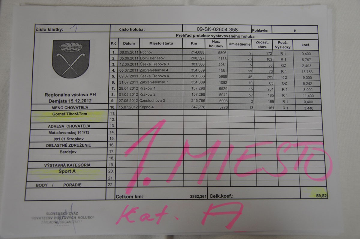 Víťazná kolekcia holubov KDTVR Šariš 2012Vďaka pomoci Jozefa Bednára ml. a ochote organizačného výboru regionálnej výstavy KDTVR Šariš sa podarilo zvečniť víťazné holuby pre jednotlivé kategórie v sezóne 2012 a máte tak možnosť prezrieť si to najlepšie, čo lietalo na východe Slovenska aj na našich stránkach. Kategória ŠPORT A 09-SK02604-358 H - Gornaľ T + T 09-SK02604-358 H - Gornaľ T + T| umiestnenie | holub | pohl. | chovateľ | OZ | koeficient |