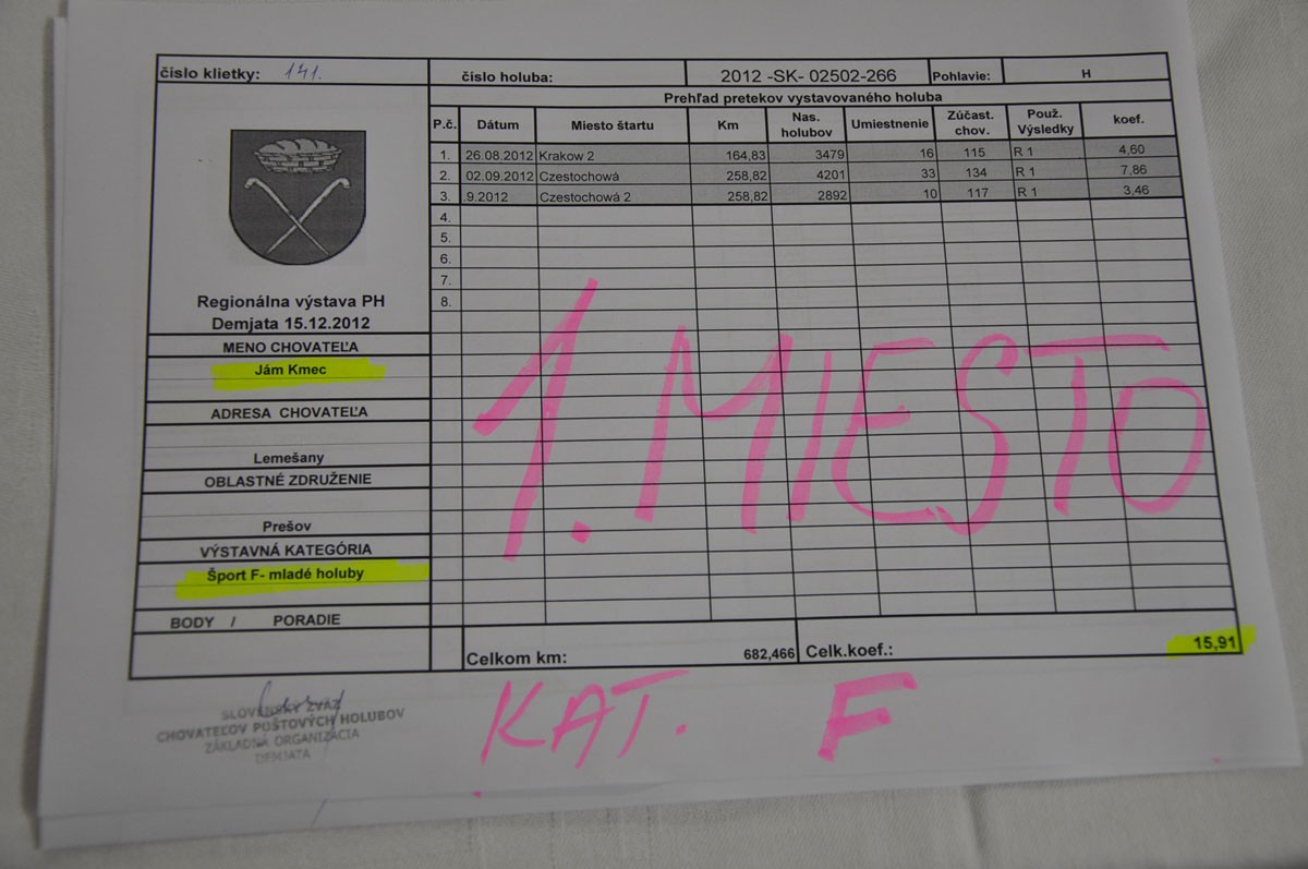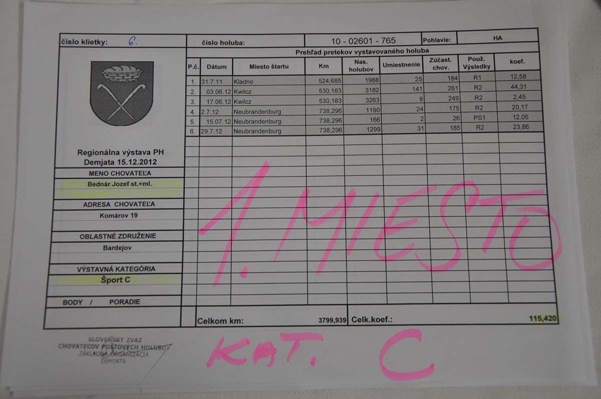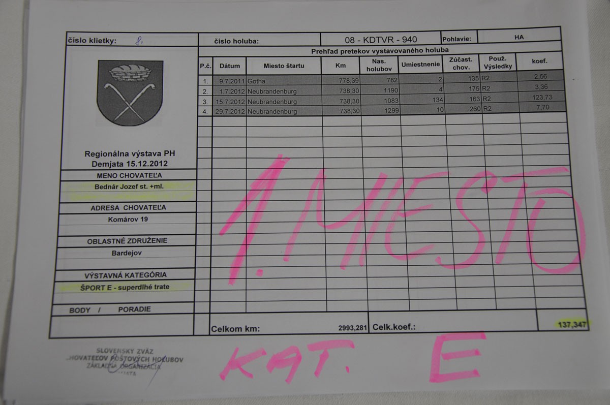 | 1. miesto | 08-KDTVR-940 | A | Bednár J st.+ml. | BJ | 137,347 | | 2. miesto | 08-SK02606-58 | H | Dulák Peter | BJ | 175,652 | | 3. miesto | 09-SK02407-41 | H | Plesko Marek | KE | 185,695 | Kategória ŠPORT F 12-SK02502-266 H - Kmec Ján 12-SK02502-266 H - Kmec Ján| umiestnenie | holub | pohl. | chovateľ | OZ | koeficient |