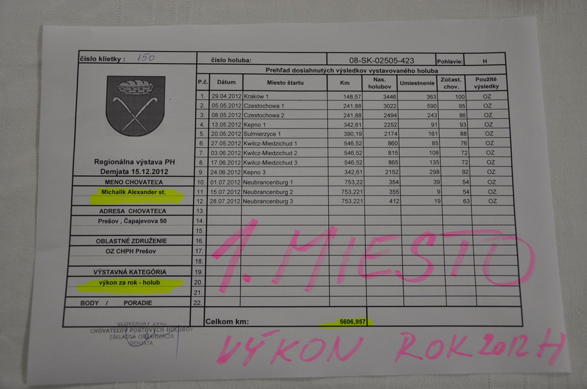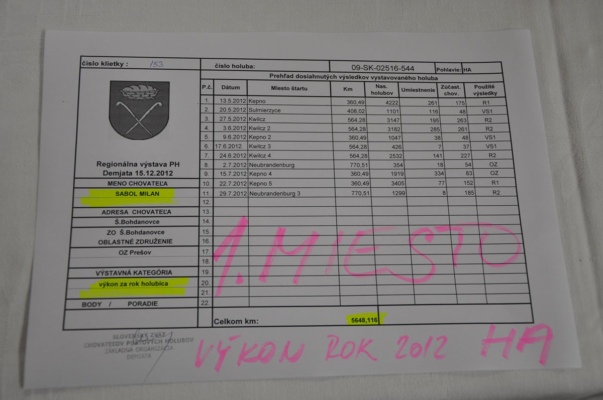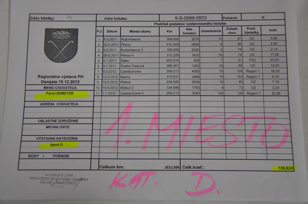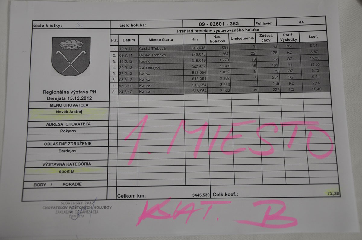 | 1. miesto | 08-KDTVR-940 | A | Bednár J st.+ml. | BJ | 137,347 | | 2. miesto | 08-SK02606-58 | H | Dulák Peter | BJ | 175,652 | | 3. miesto | 09-SK02407-41 | H | Plesko Marek | KE | 185,695 | Kategória ŠPORT F 12-SK02502-266 H - Kmec Ján 12-SK02502-266 H - Kmec Ján| umiestnenie | holub | pohl. | chovateľ | OZ | koeficient |