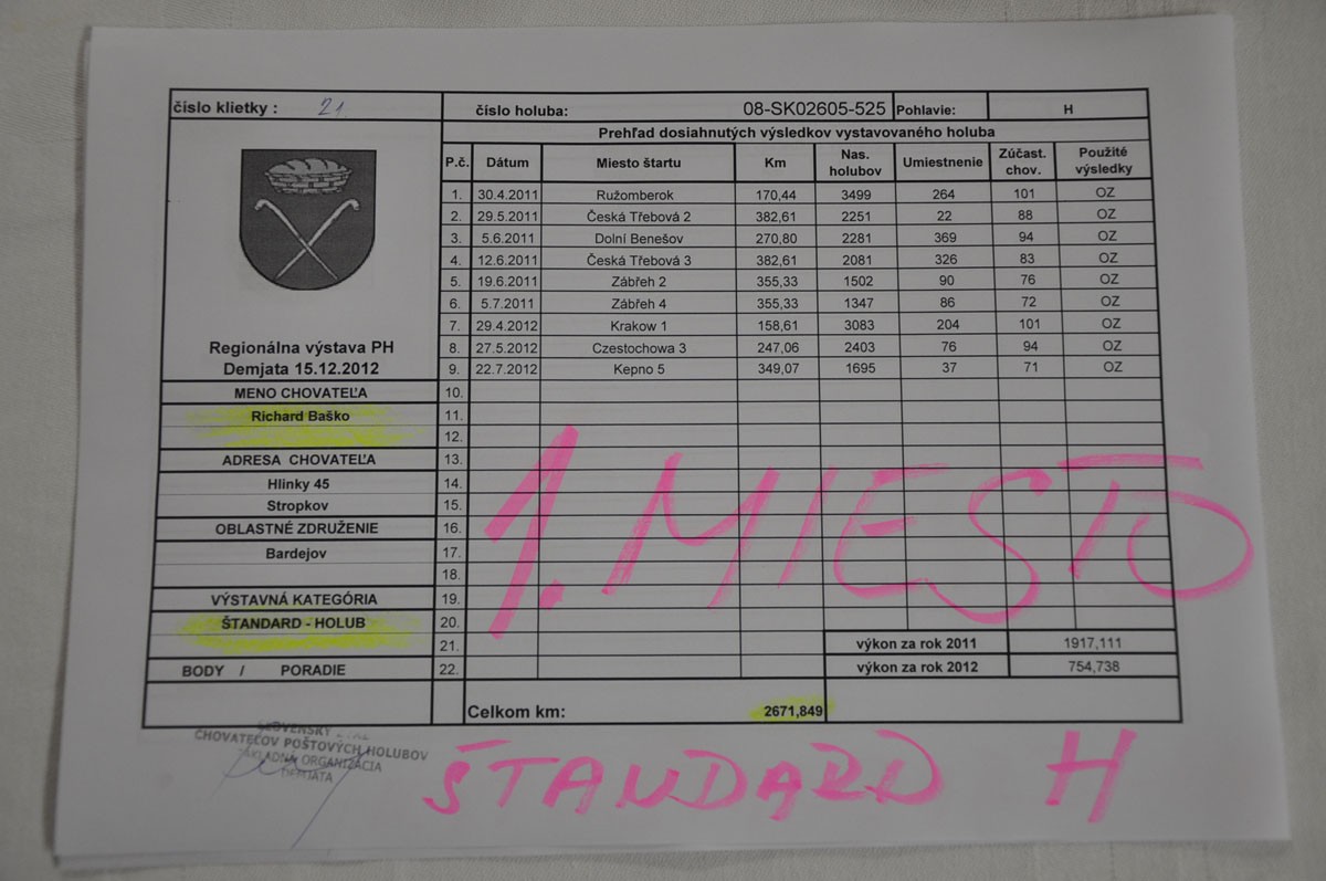 | 1. miesto | 08-SK02605-525 | Baško Richard | BJ | 2671,249 | 92,75 | | 2. miesto | 08-SK02604-86 | Gornaľ T+T | BJ | 4047,538 | 92,50 | | 3. miesto | 08-SK02606-849 | Rodak Ivo | BJ | 2636,338 | 92,50 | Kategória ŠTANDARD HOLUBICA 07-SK02516-698 - Vojtko Milan 07-SK02516-698 - Vojtko Milan| umiestnenie | holub | chovateľ | OZ | koeficient | Body |