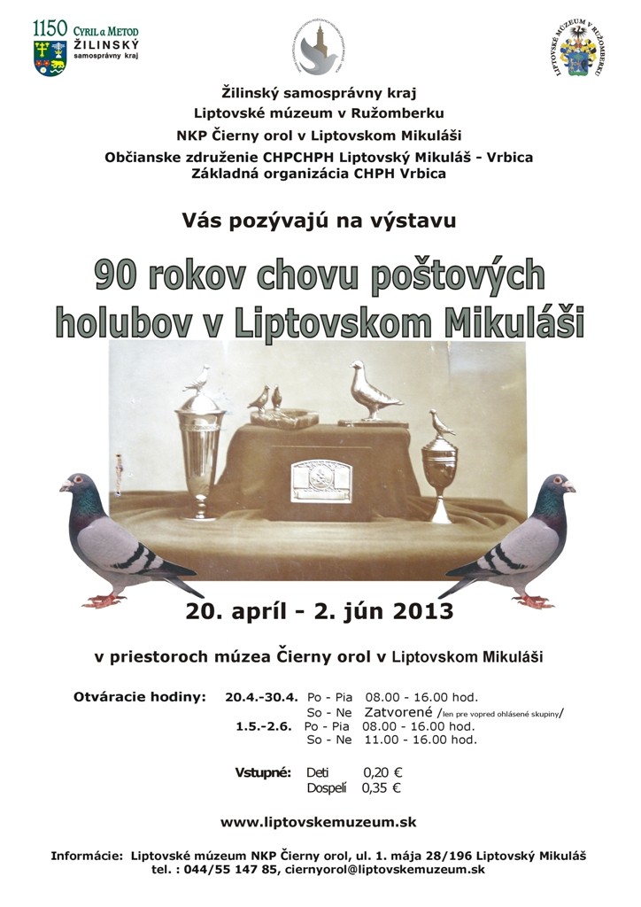 Úvod · Články o poštových holuboch · Ostatné · ZO Vrbica oslávila 90 rokov od založeniaZO Vrbica oslávila 90 rokov od založeniaKoncom apríla sa v Liptovskom Mikuláši uskutočnilo slávnostné zhromaždenie pri príležitosti osláv 90. výročia založenia prvej organizácie chovateľov poštových holubov na Slovensku. Záštitu nad podujatím prevzal predseda Žilinského samosprávneho kraja Juraj Blanár. Hostia si okrem jeho príhovoru mohli vypočuť aj slová nášho novozvoleného prezidenta Daniela Dudzika, prvého slovenského Olympionika Jána Prognera. Stretnutie malo veľmi symbolický charakter, bolo na ňom odovzdaných množstvo čestných ocenení pre chovateľov, ktorí sa zaslúžili o rozvoj a celoživotnú podporu chovu poštových holubov na Liptove a na Slovensku. Pri príležitosti osláv však treba spomenúť ešte jeden veľmi významný fakt - organizátori pripravili pre chovateľskú ale aj širokú verejnosť zbierku vzácnych holubárskych artefaktov, ktorá je dostupná do 2. júna 2013 v priestoroch Liptovského múzea. ![]() Pozvánka do múzea Publikované: 19. mája 2013 | Zobrazené: 2058x | Kategória: OstatnéPridal: Dušan Konečný Galéria:Počet komentárov: 1